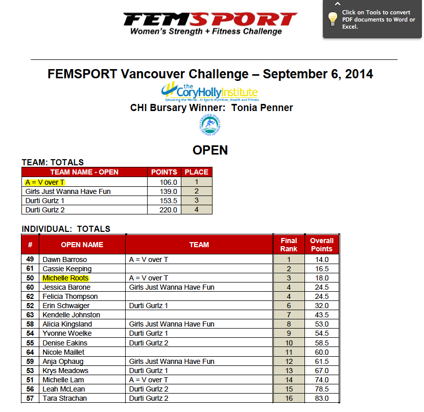 Well another year of Femsport has passed and once again it was an amazing event filled with a number of inspiring strong women! I can honestly say competing in this event has become one of the highlights of my year and I can’t wait to do it all again next year. Femsport is a unique fitness competition for women only and is open to anyone and everyone who wants to compete; however, there are some amazing athletes that show up at this event! Competing alongside some of these great athletes in Vancouver is definitely an experience to remember and this year my teammates and myself walked away with the GOLD MEDAL!!! I also managed to take the BRONZE MEDAL in the individual all around and finished first overall in my division in the box jump event, which were both unexpected but I’m humbly extatic as I have worked very hard ths year! I highly recommend this event to anyone who loves some good healthy competition and wants to challenge themselves while being inspired by some of the fittest ladies in Vancouver, I will be back next year for sure!