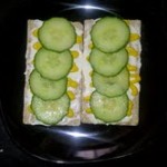 Spread an even distribution of Laughing Cow Cheese on each piece of Wasa Bread, then drizzle a litle bit of mustard on top of each piece, lay sliced cucumber on the top and ENJOY 🙂